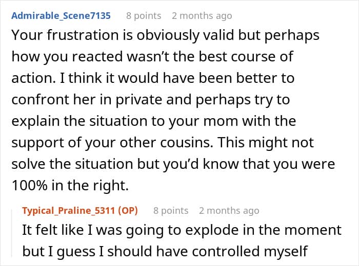 The cousin stormed out in tears but then the teen took heat from their relatives for being “cruel”