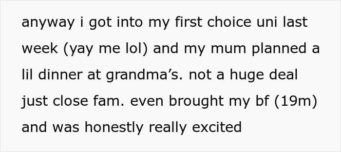 So, the Original Poster (OP) is 18 years old. She recently got into her first choice university, and was very proud of it. To celebrate her success, the family gathered for a special dinner – and it was at this gathering that everything happened. Long story short, our heroine snapped at her cousin “Camila.”