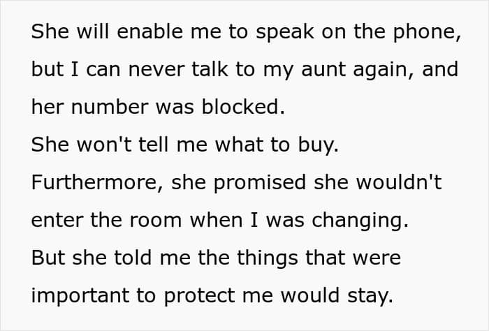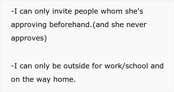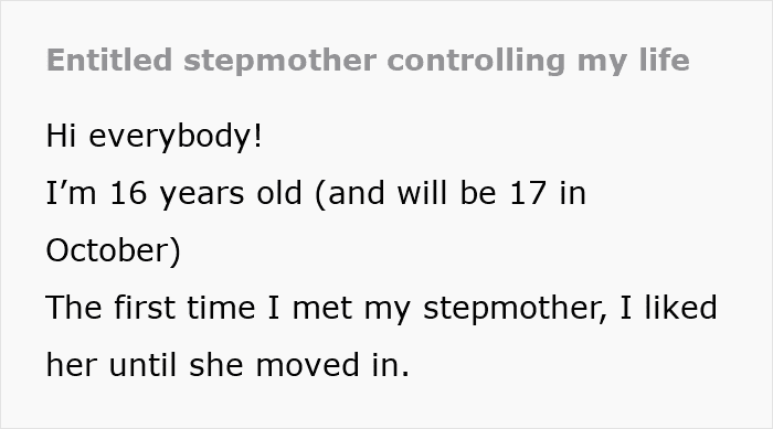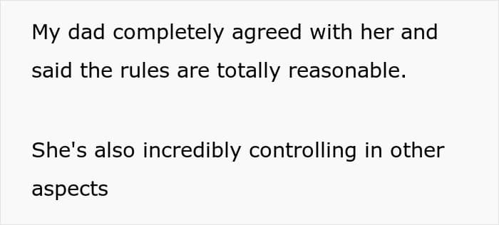 The problem is that the poster’s own dad agreed with all of these commands and didn’t see anything wrong with his daughter being controlled to such an extent. That’s why the teen found herself in a helpless situation, where she couldn’t do anything she wanted to, and had to follow her stepmom’s directives.