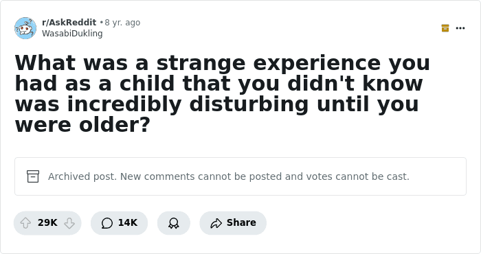 This was a topic in a Reddit thread from years back, where people shared experiences from their childhood that they didn’t know were disturbing until they grew older. Some were about near abductions, while others were encounters that nearly cost them their lives.