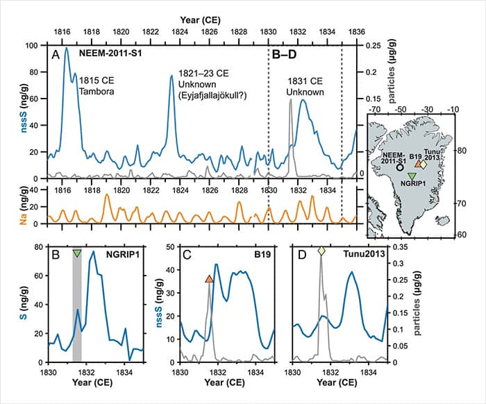 As for the 1831 case, scientists also suspected a volcanic eruption, but they couldn’t find a “suitable” event in the historic records. The prime “suspect” was the small underwater volcano Ferdinandea near Sicily in the Mediterranean, which erupted in July 1831, but the emissions there were too small to cause such severe consequences on several continents.