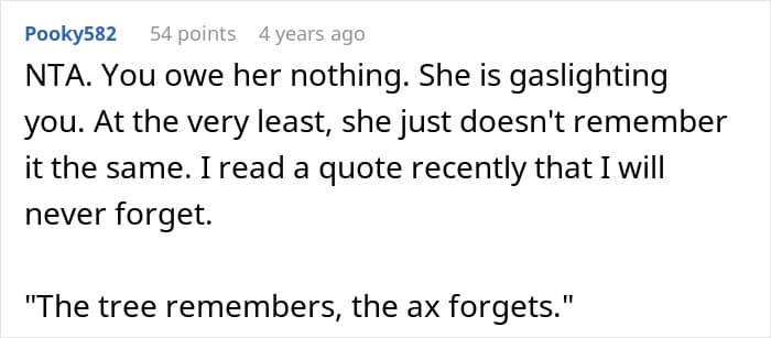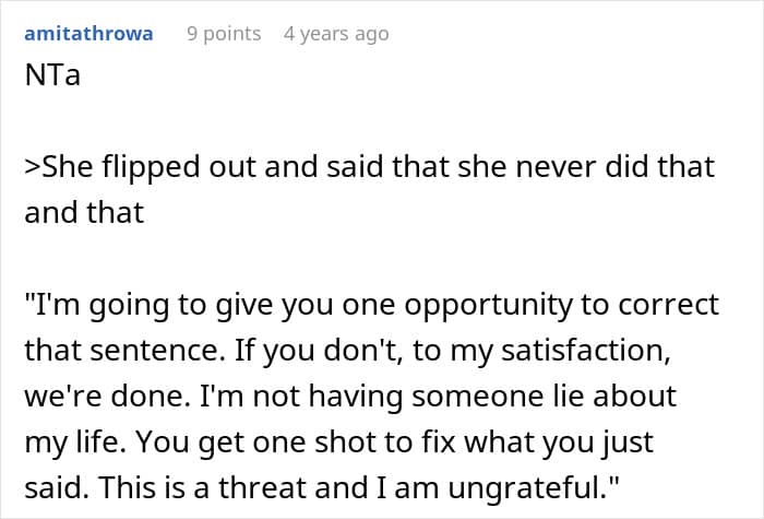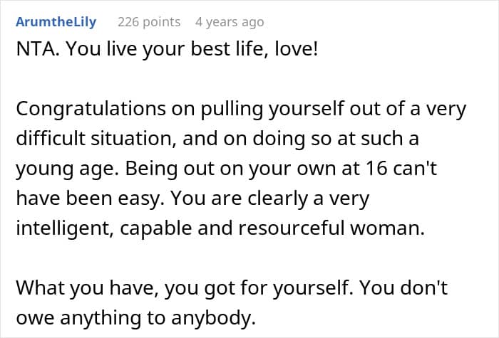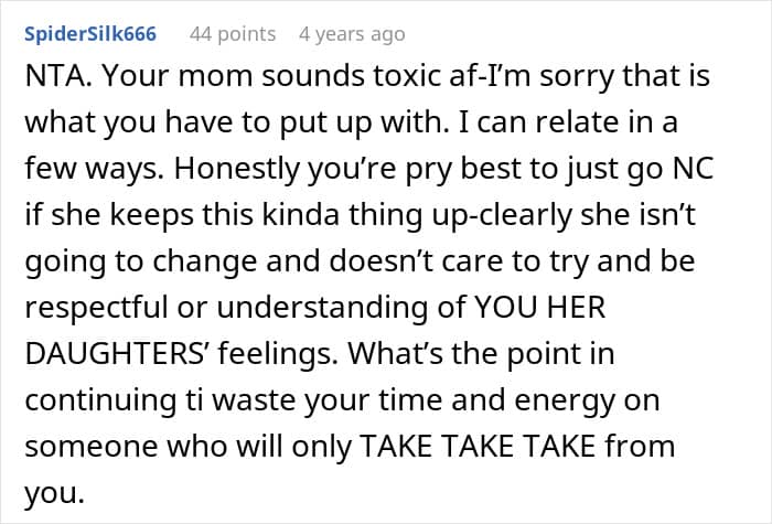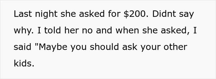 Sadly, this mom seems unaware or unwilling to admit her mistakes. In the grand scheme of things, $200 is not that much money. However, the same woman who had money to buy three children cars now has to ask her own daughter for cash is questionable. It gives the impression that she simply thinks her eldest daughter exists to do things to her, regardless of fairness. After all, she’s put in parent-levels of work so far, what’s $200 more? Even the fact that this woman has to go online and ask if she was right is a clear indication that her perception of this relationship has been so badly skewed.
