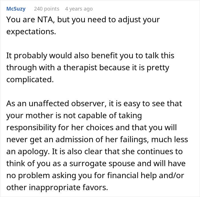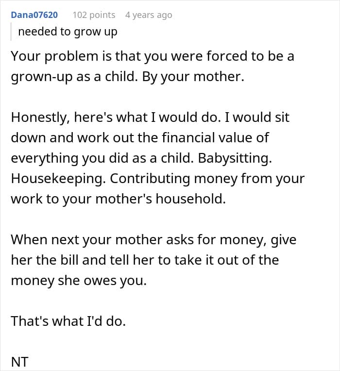 At the same time, the woman’s issue here isn’t necessarily the pressures put on her as a teen, nor the sacrifices she had to make, rather, she is unhappy that her mother didn’t seem to acknowledge it. After all, had she been gifted a car or given some money to help with college, perhaps she wouldn’t feel this way.