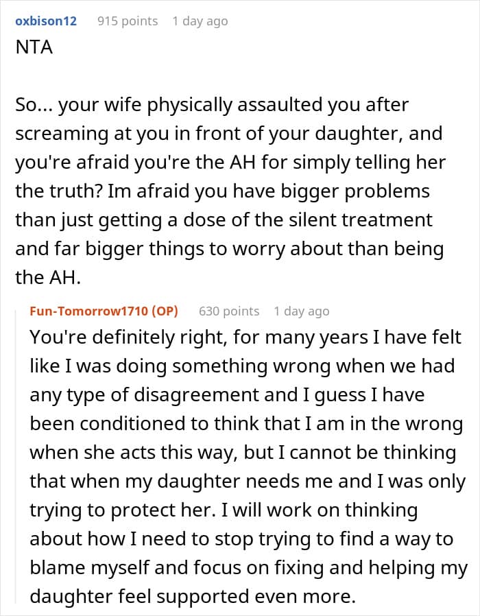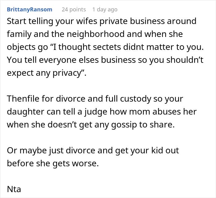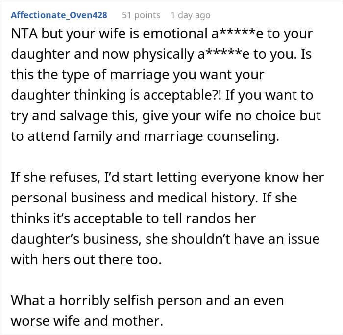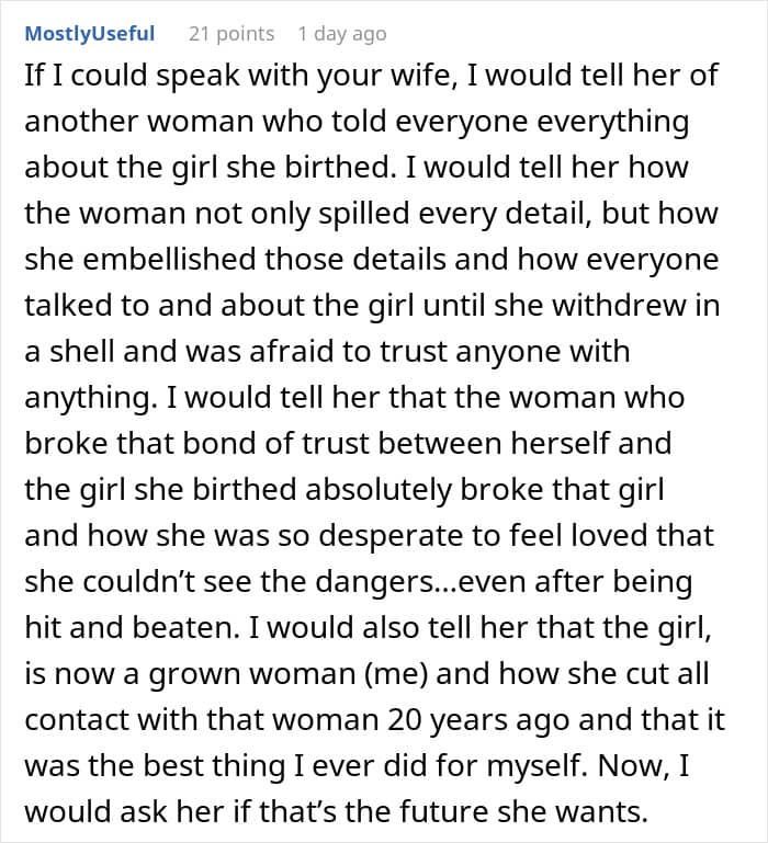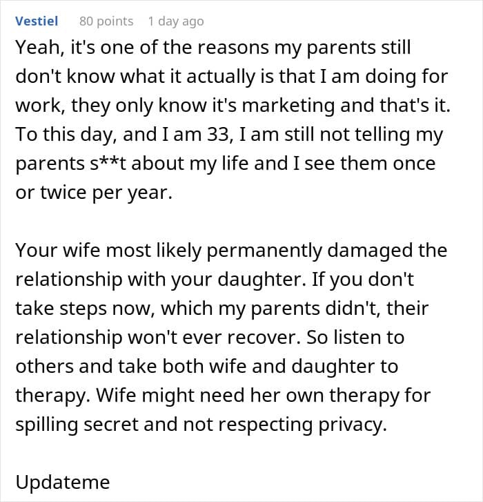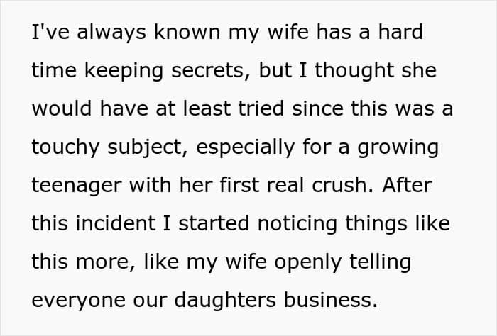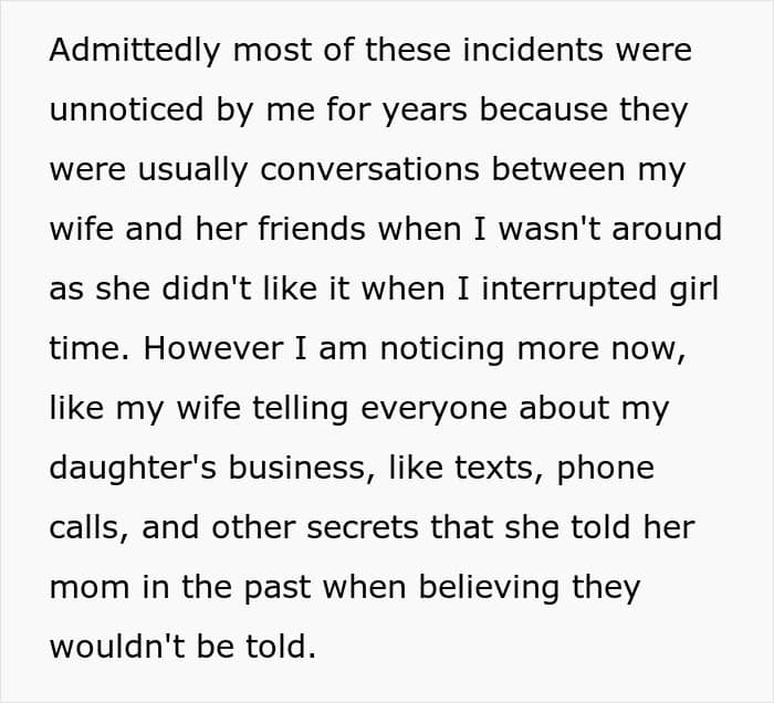 And parents play a key role in creating that space at home, showing they can be trusted with personal opinions and deep, complex emotions. Reddit user Fun-Tomorrow1710 recently shared a story that highlights just how fragile these bonds can be. In the post, the dad describes ongoing tension in his family and blames his wife for repeatedly exposing their daughter’s private life to friends and relatives.
