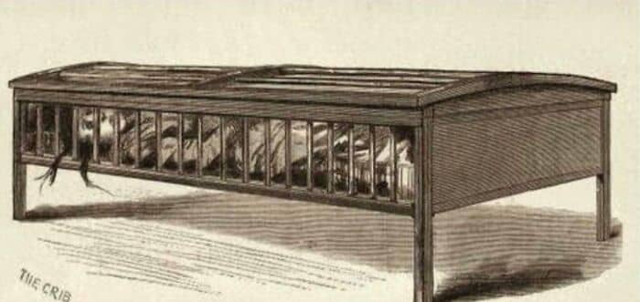 The Utica Crib, as shown in this illustration, was a crib like structure used in mental asylums and institutes from the 19th to 20th centuries, it was used to restrain patients from lashing out.