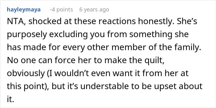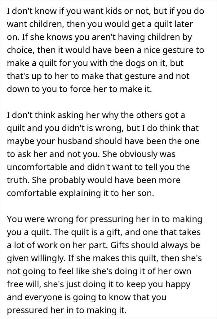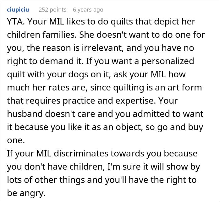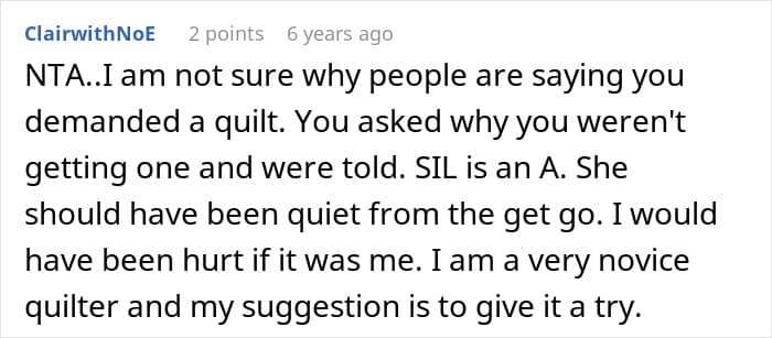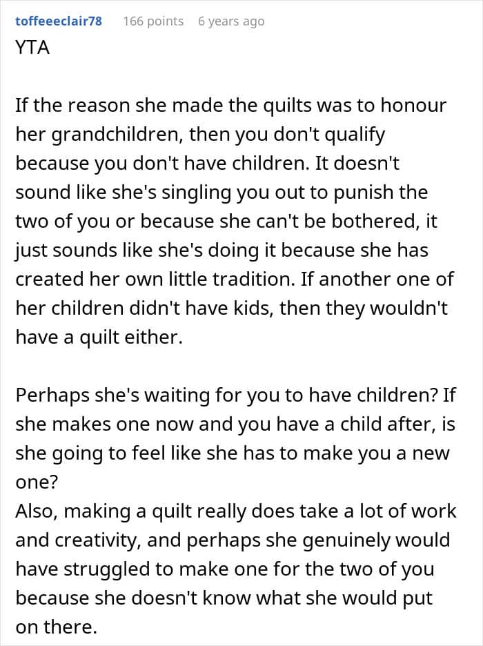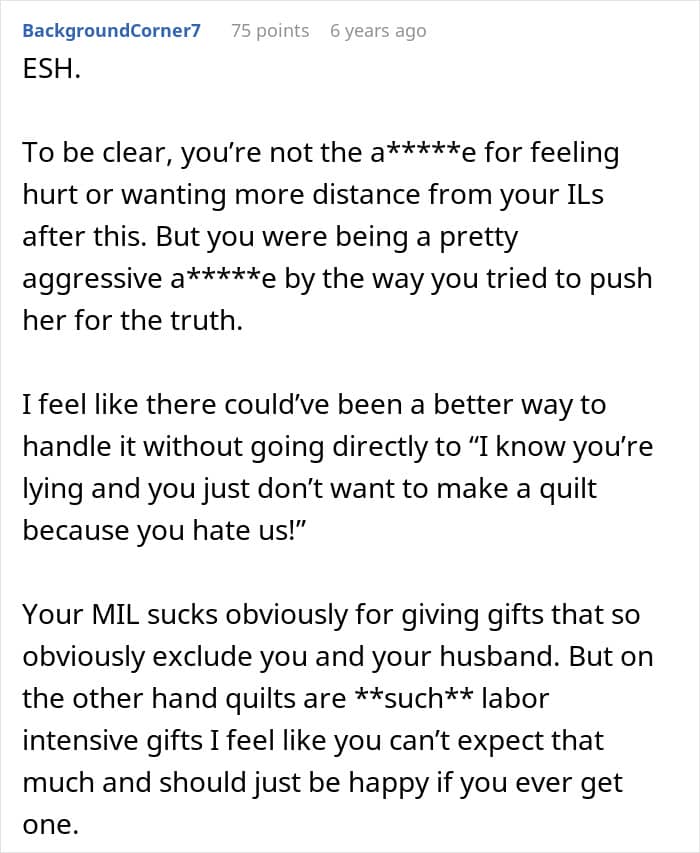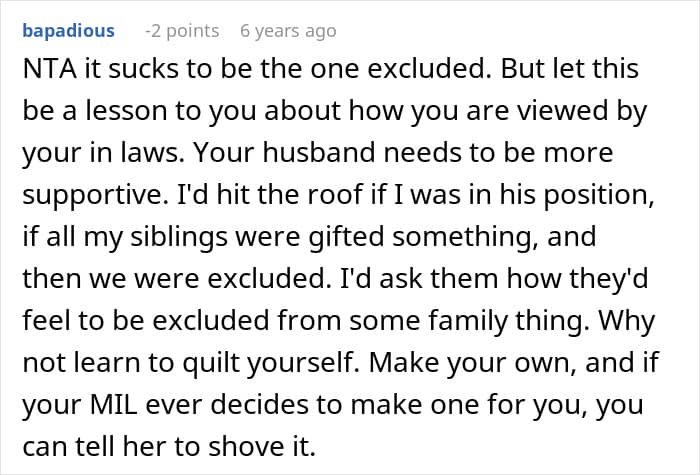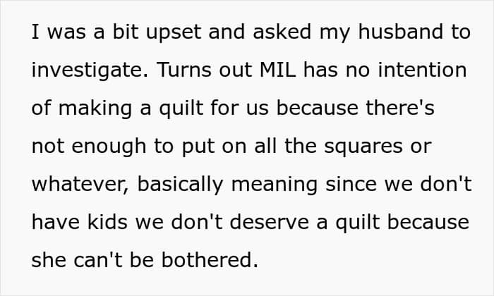 But stepping into a new family can be challenging if you just can’t manage to find your footing. Especially when it feels like you’re not being treated as an equal. One woman reached out to Reddit for advice after her mother-in-law made a quilt for all of the couples in their family except her and her husband. Below, you’ll find all of the details, as well as some of the thoughts readers had about the situation.