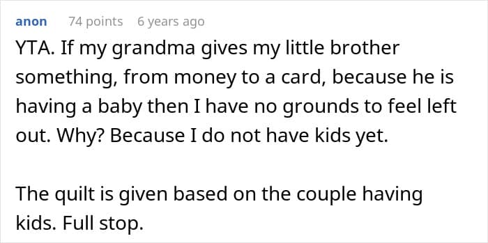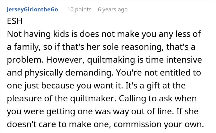 Many readers gave the author a reality check, noting that she was not entitled to a quilt