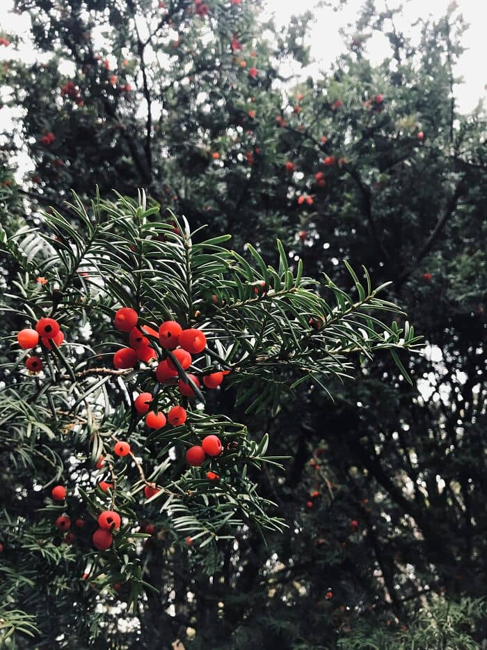 Yew berries. The only nonpoisonous part of a tree that every other part is deadly. Including the seed inside.