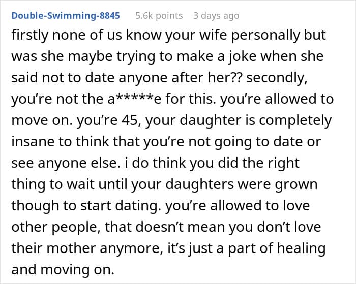 Six years ago, the OP lost his wife after a short illness. The day before she passed away, she stated that if she passed, he wasn’t allowed to date. He laughed it off at the time and said he wouldn’t, but her sudden passing made the words stick. For years, he honored that “promise” without really meaning to, focusing entirely on raising his daughters.