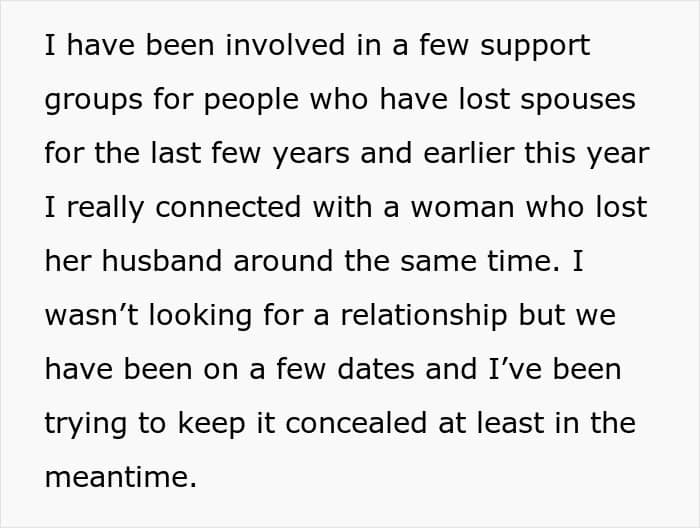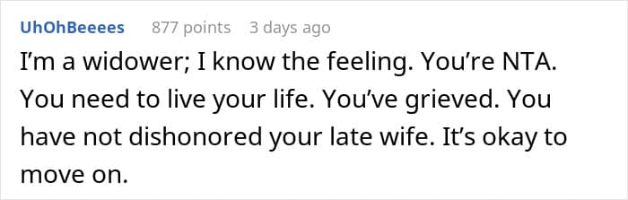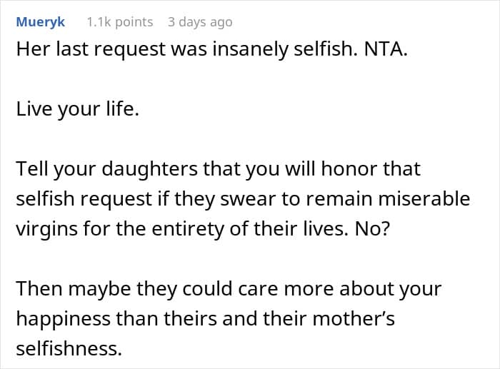 The Original Poster (OP) lost his wife, but not before she requested that he not date anyone after her. After six years of being a single parent, he finally dipped his toes back into dating, only to be accused by his daughter of betraying his late wife’s memory.