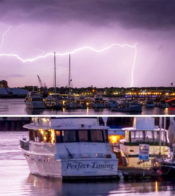 #14 Brother Spent A Year Trying To Get A Lightning Photo. He Caught This Last Night, I Just Noticed The Boat In The Bottom Left