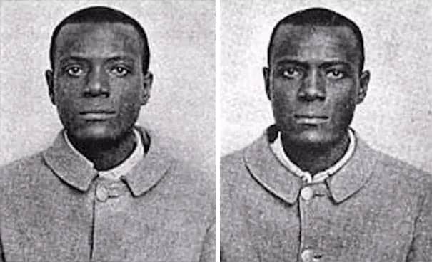 These are the mugshots of William West and William West, and they are not related. They were both sent to Leavenworth Prison at the same time, in 1903, and after some confusion, the staff understood they had two different prisoners with the exact same name, who looked exactly alike. They are part of the reason fingerprints are now used as identification.