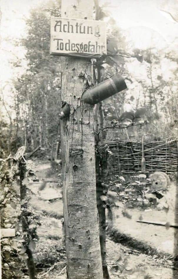 #80 “Beware Of Death” Sign Above An Unexploded Shell In A Tree During WW1