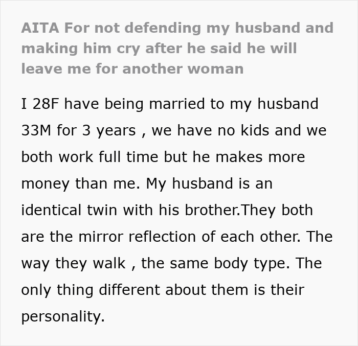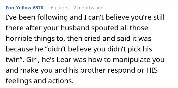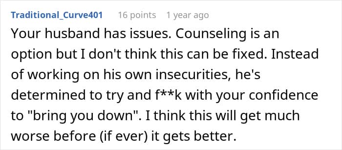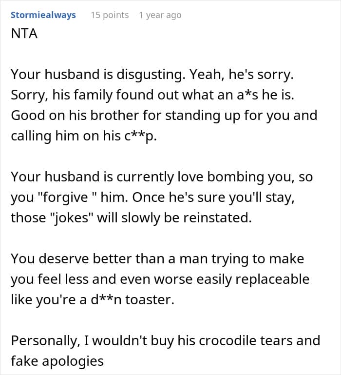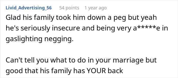 That’s exactly what one woman began to question after her husband kept making comments at her expense, brushing them off under the guise of humor. Things finally came to a head at a family dinner when he told her she should feel lucky he still found her attractive after three years of marriage. What he didn’t count on was his parents and brother refusing to let it slide.