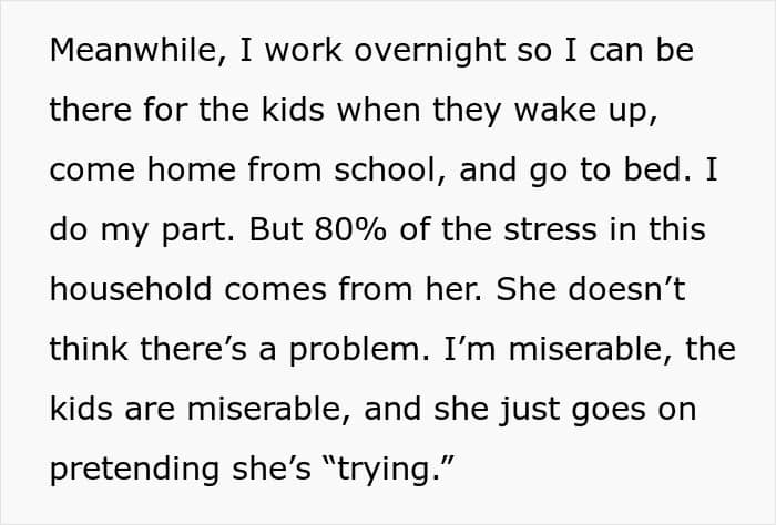 The poster felt stressed and miserable because of his wife’s behavior, and even his children felt stifled by the toxic environment their mom had created