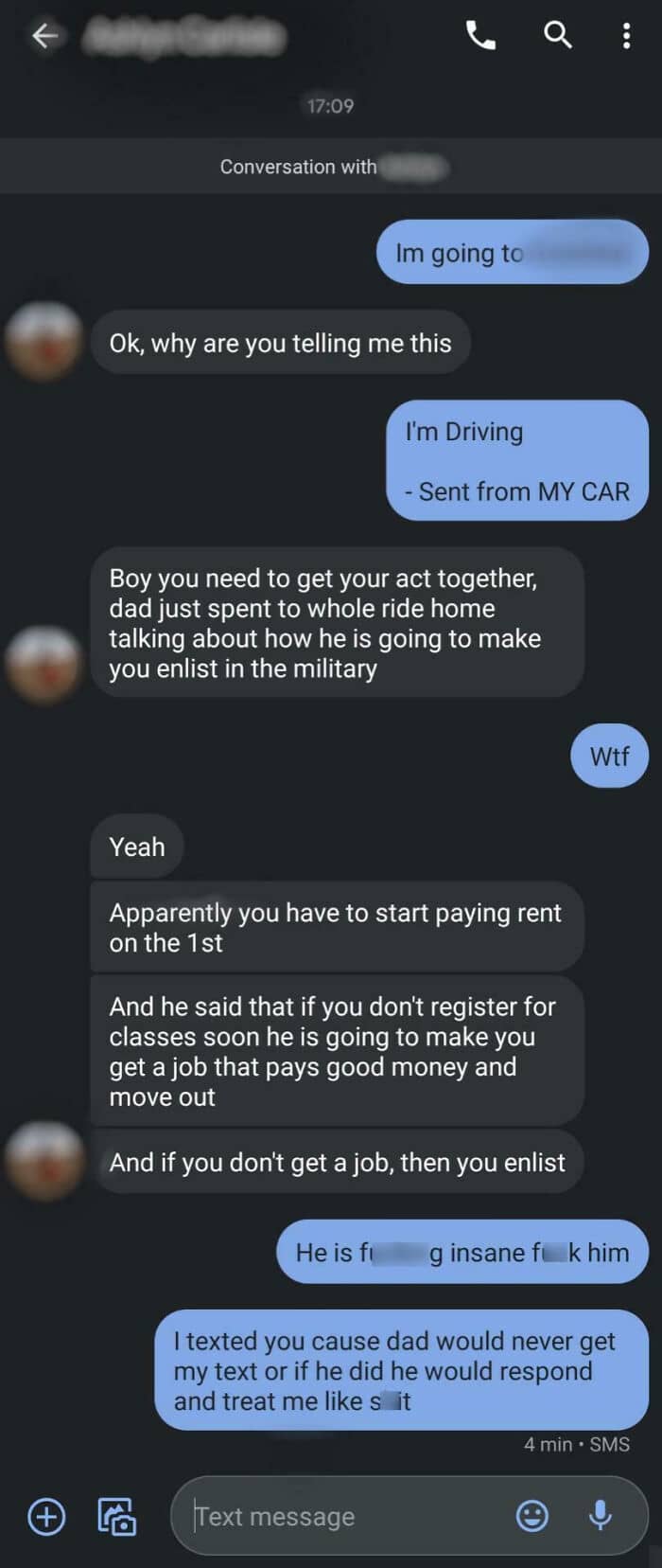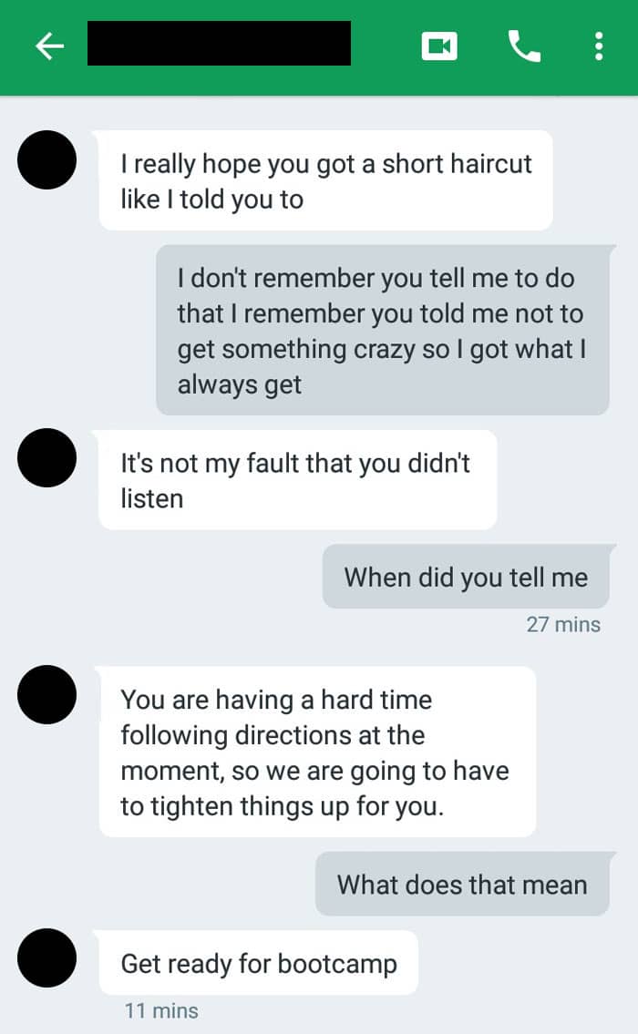 #6 My Dad Is Sending Me To Boot Camp This Month Because I Didn’t Get My Hair Cut The Way He Wanted. I Was Sobbing In The Back Of My Work When He Sent Me These Messages