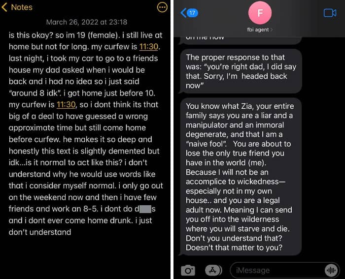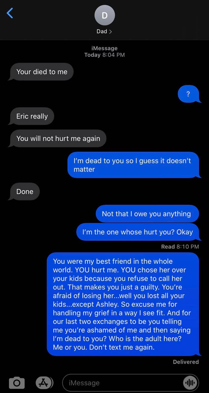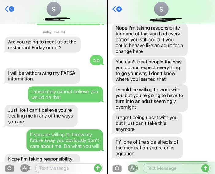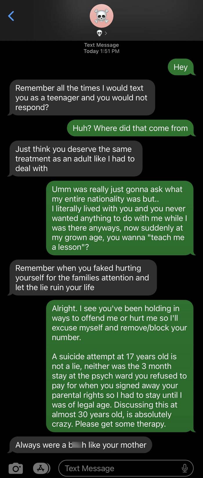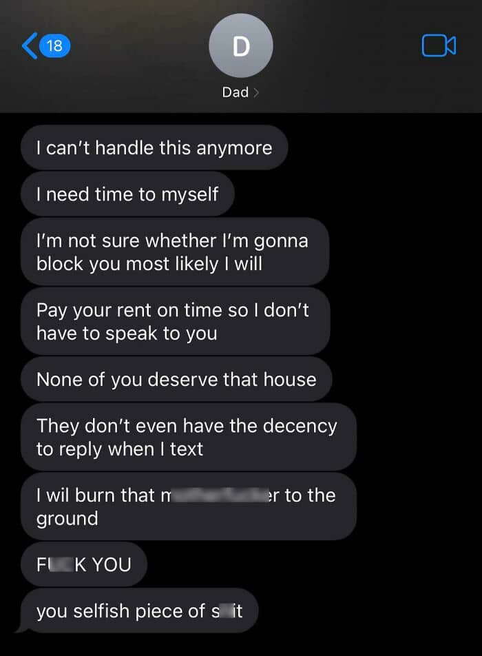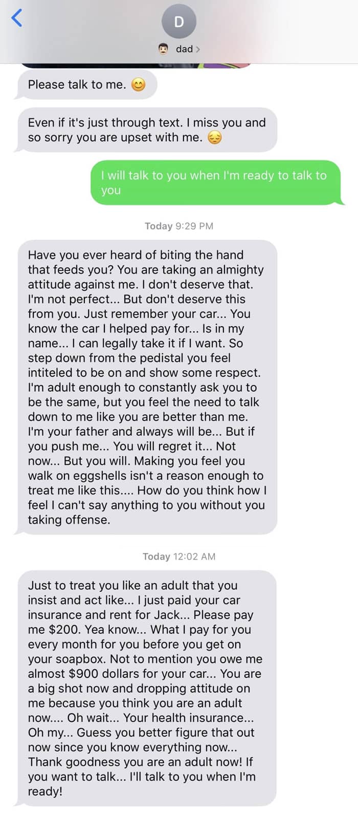 I had just turned 18 and moved out of my dad’s apartment into my mom’s because he’d constantly be drinking and saying horrible things to me and then wouldn’t remember it in the morning. I have more of these texts (16 more screenshots to be exact) but they’re kind of painful to read back. I honestly don’t really know if I was entitled to leave like that. I don’t know what’s wrong with me. Maybe I’m the insane one.