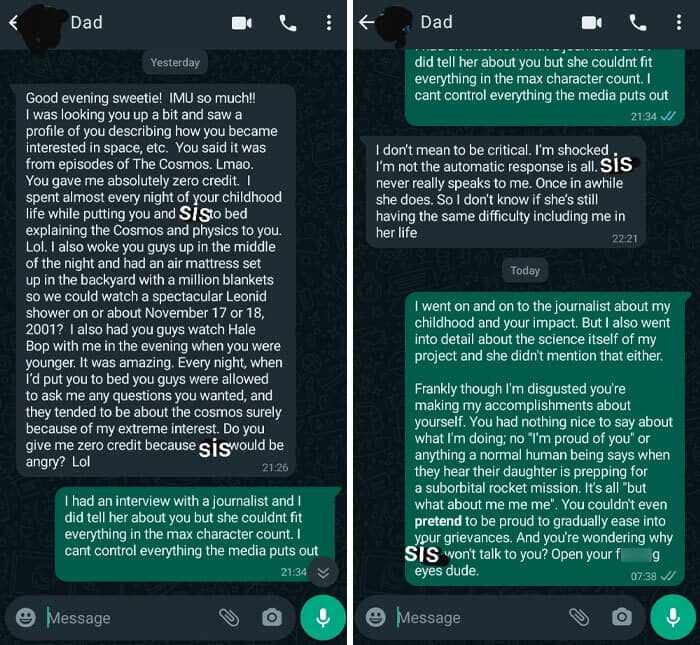 For context, my sister and I are very low contact with our father. There was a small news article about my participation in a space mission and he is upset the journalist didn't credit him for my interest in space.