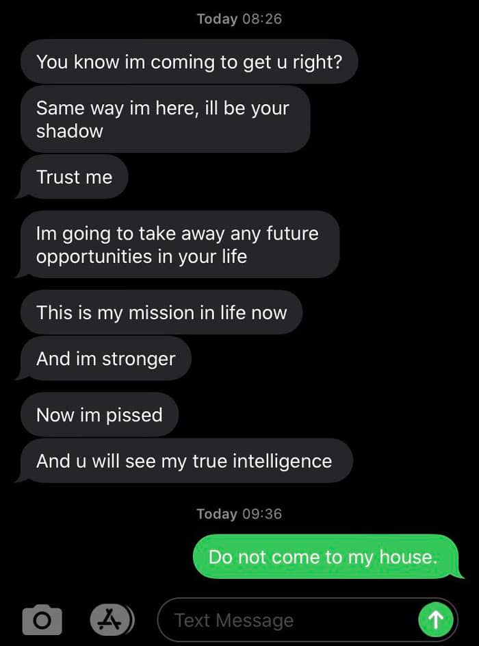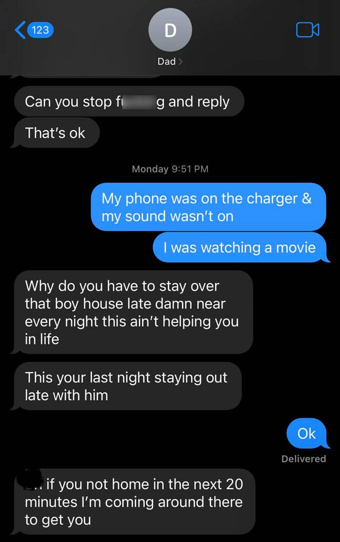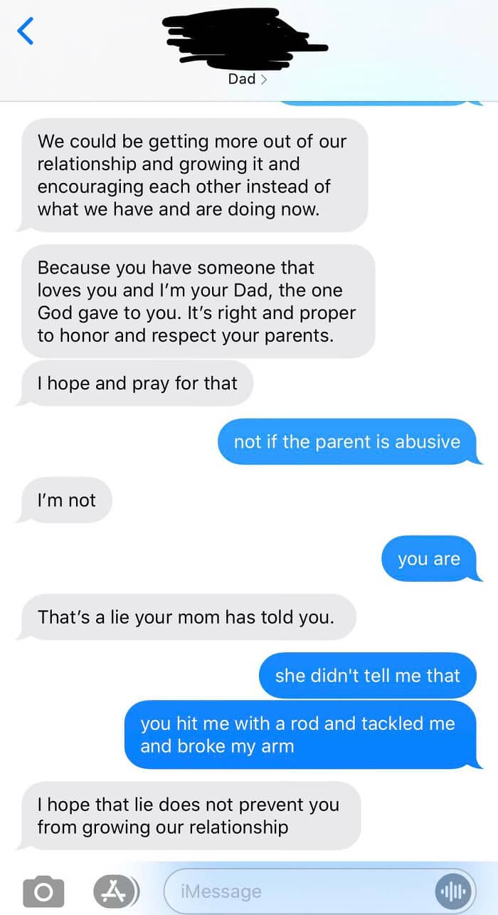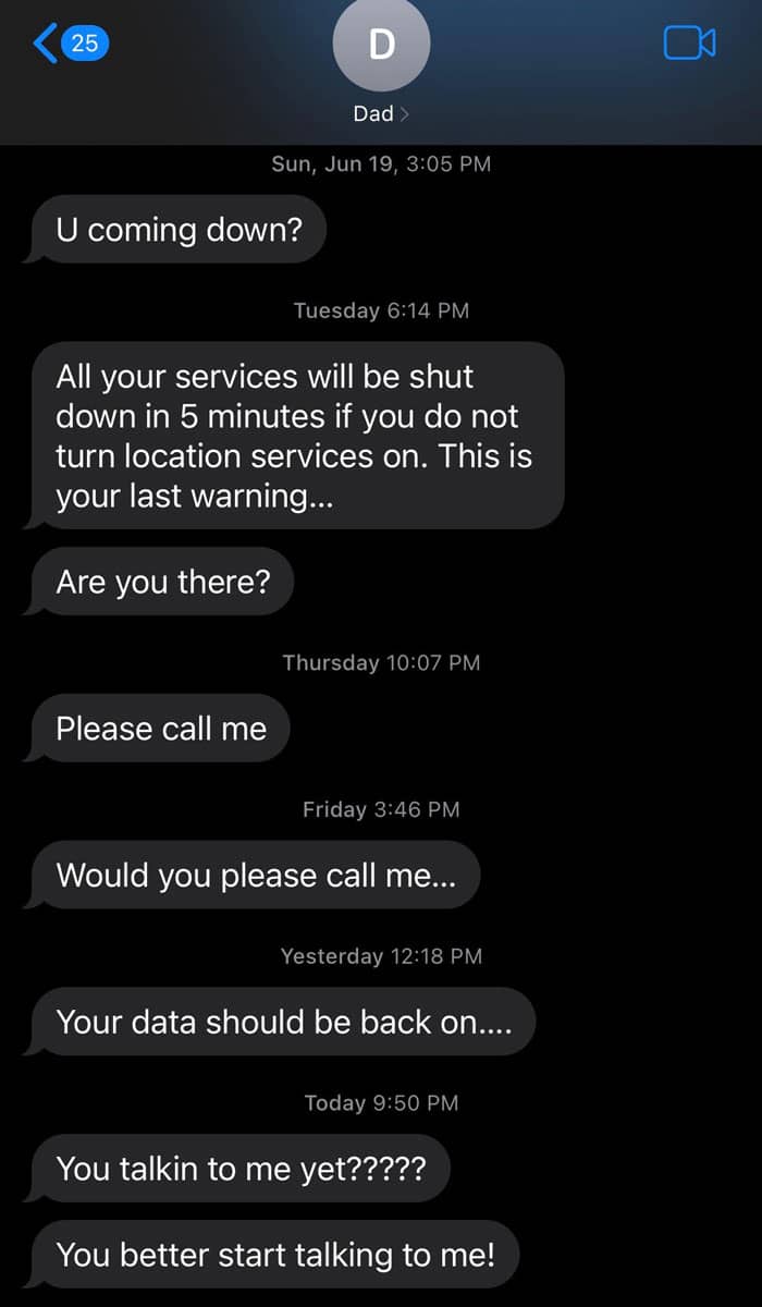 I don’t have a phone plan, so I didn’t get any of these messages until I got home. I do not live with him, so I’m not worried about my safety. Also, the cut-off message says: “Dad, I don’t have data on my phone”.