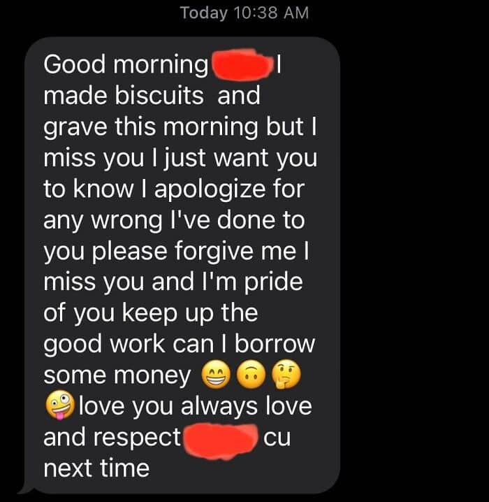 He sent me 900$ in 2012, I was using in 2014-2016. When I got sober I made a decision to completely cut him out, he’s extremely racist and “born again Christian” and it’s been going well. The mountains of texts before this public post are similar.