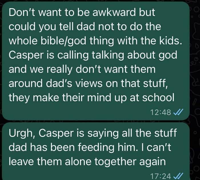 My son (7) spent an afternoon with my dad today who is a fundamentalist Christian. My son first video called us and said god is real, why didn’t we know that. After he was dropped off, he was telling us how he needs to pray, the devil is real, everyone is corrupted etc. He now believes it’s all true because my dad has said it. I’ve always taught both sides and said it is up to them to decide.