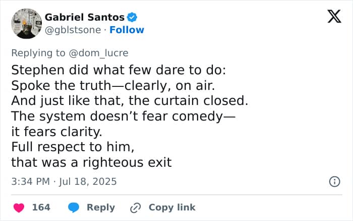 “Stephen was red hot tonight in his monologue. Go, Stephen, go!” wrote one user.