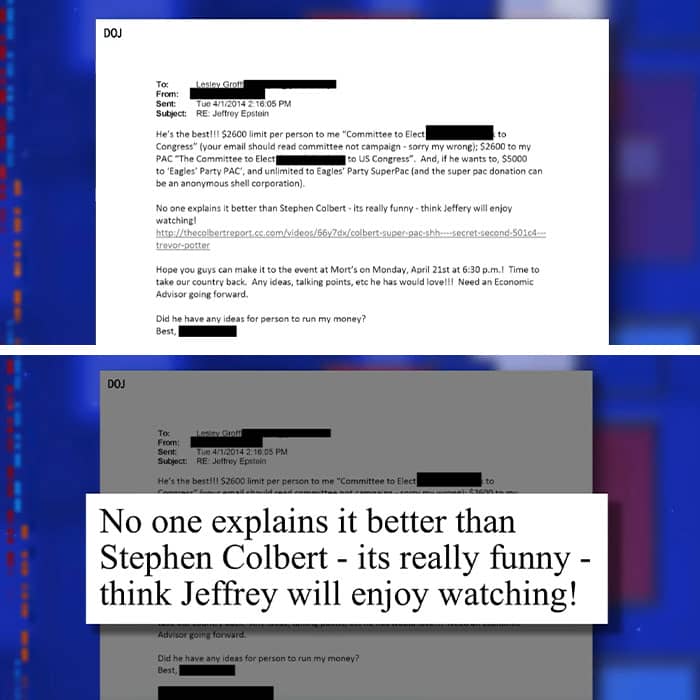 He explained that his name appeared in an old email sent to Lesley Groff, Epstein’s longtime executive assistant. The message came from one of Epstein’s associates, who recommended that Epstein watch Colbert’s breakdown of Super PACs from The Colbert Report.