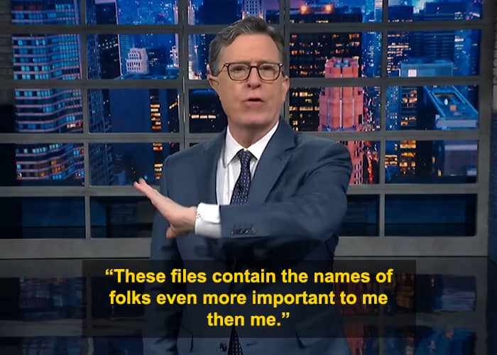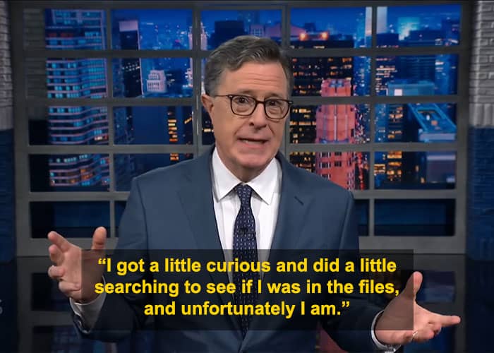 During the episode, Colbert admitted to viewers that he searched his own name in the newly released Epstein files.