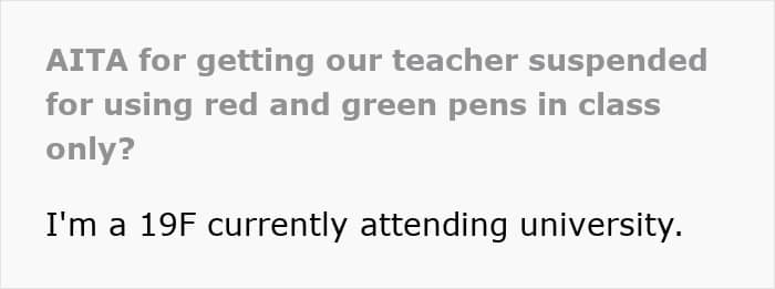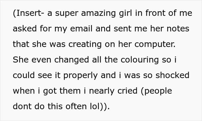The OP was in despair, but another student helped her with her notes. She photographed all the drawings and diagrams for her, replacing one of the colors with blue. As for the teacher, the author reported this case to the head of the school, and by the next lecture, it became clear that the toxic guy had been suspended. So the OP was in two minds whether she was right to ruin his career over her case.