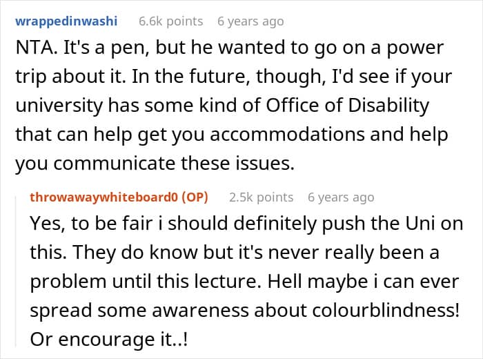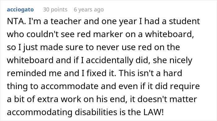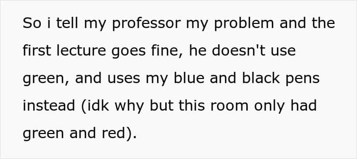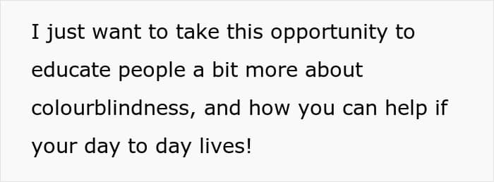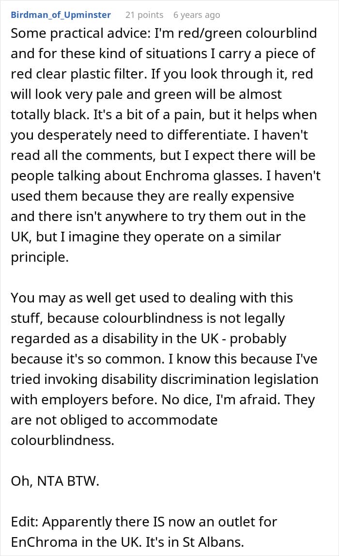 In Zuckerberg’s case, by the way, that’s why Facebook’s logo and color scheme are blue – it’s the color most red-green color-blind people see well. But the user u/throwawaywhiteboard0, the narrator of this story, once encountered a situation where another person blatantly ignored her disability. So now, just let’s go on reading.