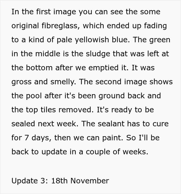 By that time, the OP had already found out that the fiberglass in the pool was badly damaged so they just decided to rip it out and start again. This time, the picky neighbors were not satisfied with the look of the concrete, although, according to the inspector, they said that “concrete is better than green.” And at that moment, it dawned on the author – after all, green is their favorite color!