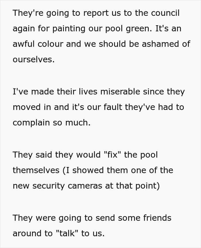 Neighbors tried to argue that painting pools green was illegal – but were unable to cite such a law. They threatened that they would invade the OP’s plot to ‘fix’ the pool – the author drew their attention to recently installed CCTV cameras. It even got to the point of threatening to invite some friends to “talk” – but then the original poster with a pure heart turned to the police.