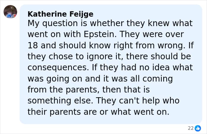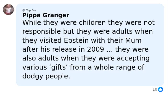 Many commenters pushed back against the idea of holding Beatrice and Eugenie responsible for their parents’ associations.