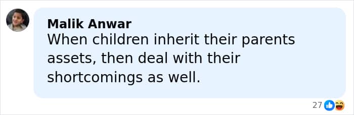 “When children inherit their parents’ assets, then they deal with their shortcomings as well,” another commenter wrote.
