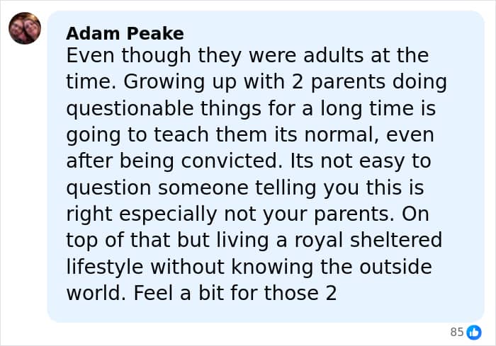 “Even though they were adults at the time, growing up with two parents doing questionable things for a long time is going to teach you it’s normal,” one person observed. “It’s not easy to question that, especially not your parents.”