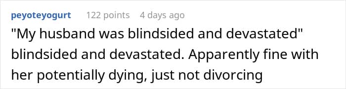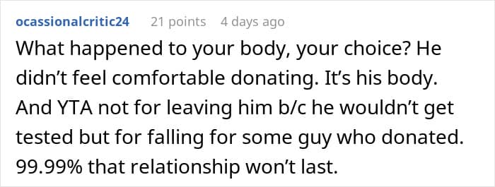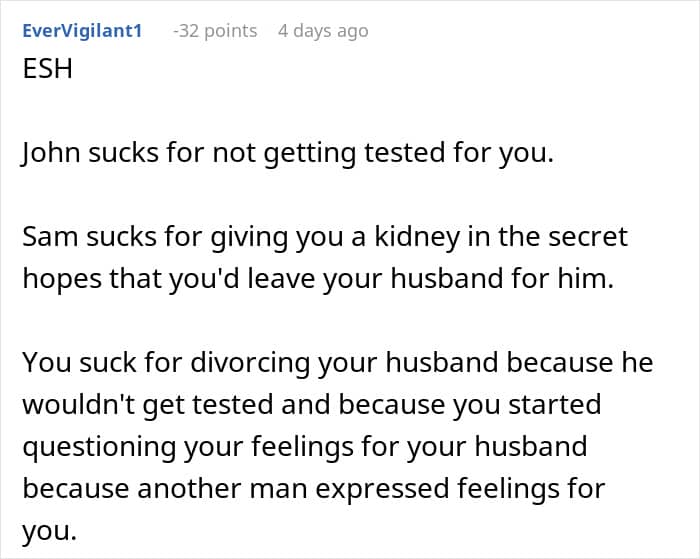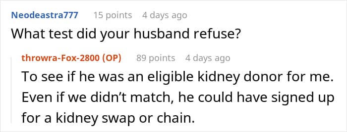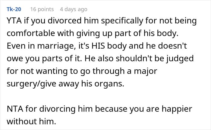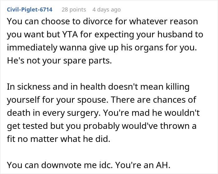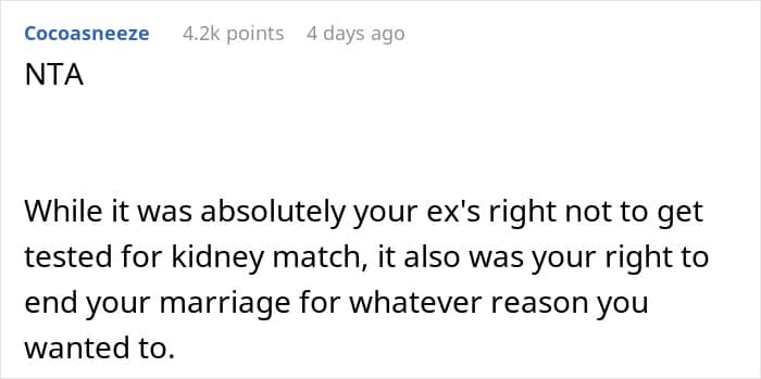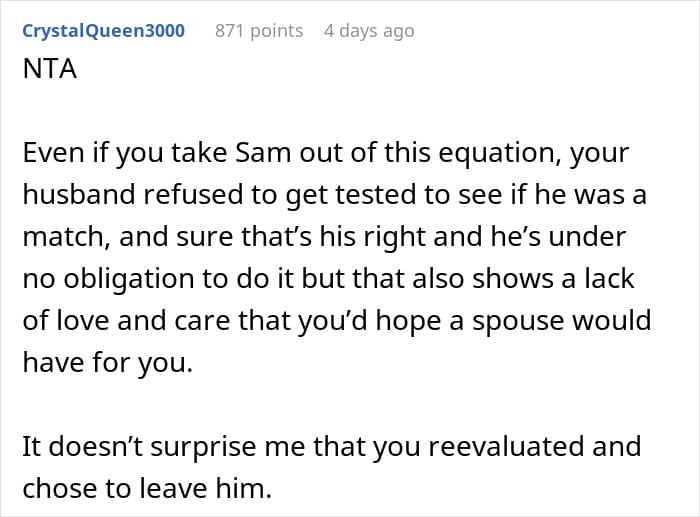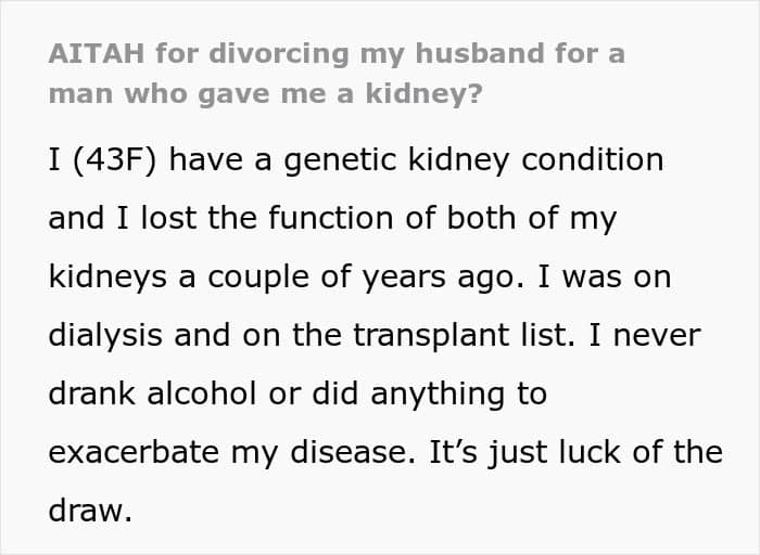 For this redditor, it wasn’t her spouse who ended the relationship when her health took a turn for the worse. She herself realized she no longer felt the same way about her husband after a friend donated his kidney for her—something her husband refused to do.