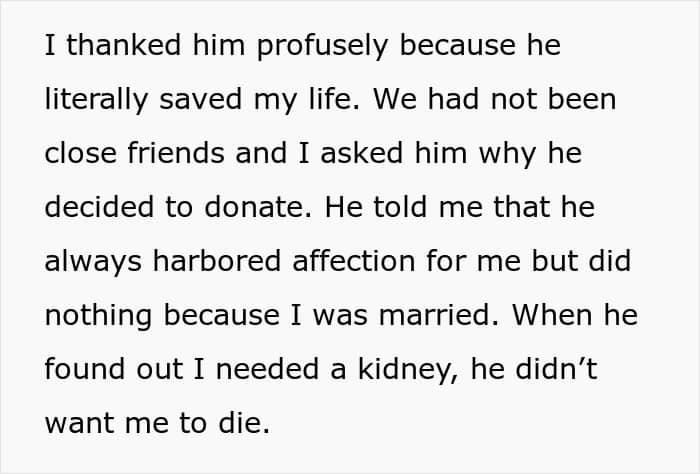 Be that as it may, every person has their own reasons whether to become an organ donor or not, as likely did the OP’s husband. But while he chose not to undergo the testing required to see if he was a good match, the redditor’s friend stepped in, which eventually resulted in the OP’s life taking another unexpected turn.