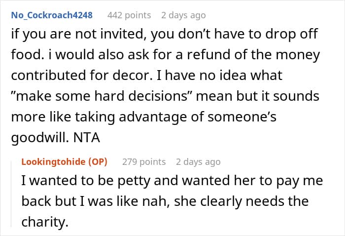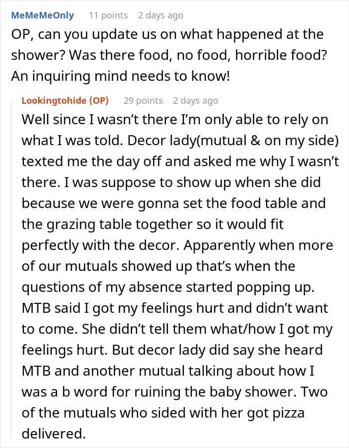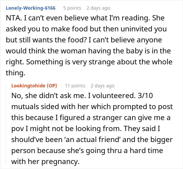 Friendships are built on mutual respect, trust, and effort. But what happens when you start feeling like you’re being used? A few days ago, Reddit user Lookingtohide shared her story on r/AITAH about being uninvited from a baby shower she had volunteered to cook for. All the hours of preparation, careful planning, and money she spent on ingredients suddenly seemed wasted—or so she thought. It turned out the mom-to-be still expected the food.