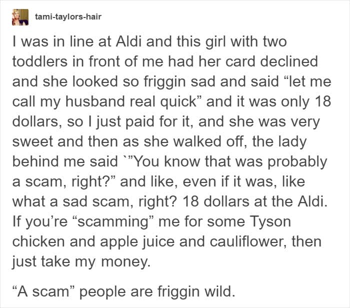 If you take a good look around, you’ll find something to smile about. But we have something that’ll make you grin like an idiot. Tumblr users have started a thread, sharing random acts of kindness they were part of, and oh my fireworks will they make you step into 2019 with the right attitude. The stories below prove that if you choose trust instead of scepticism, good things happen. Most of them are about helping someone who’s a couple of bucks short at the store, but if you can buy them happiness, why wouldn’t you? (Facebook cover image: Jason Cartwright)