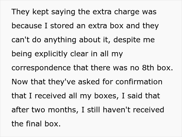 “I made an order for 4 cardboard boxes, but only received 3. That was the first time the company messed up because instead of paying for storing 4 boxes, I now paid for 7.”
