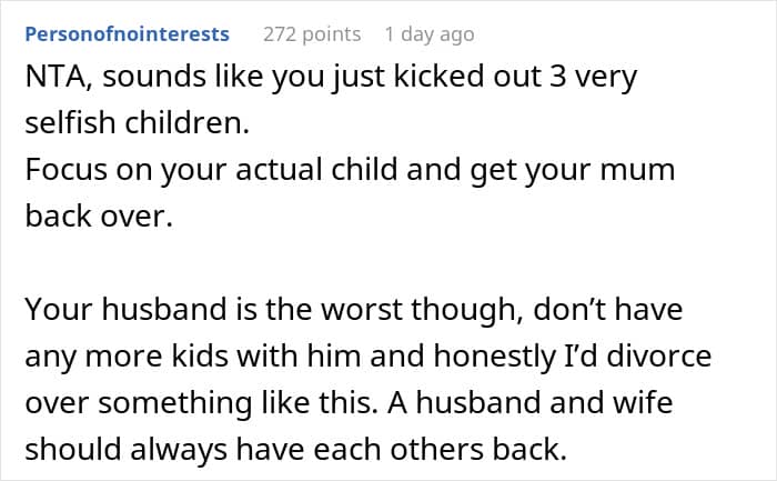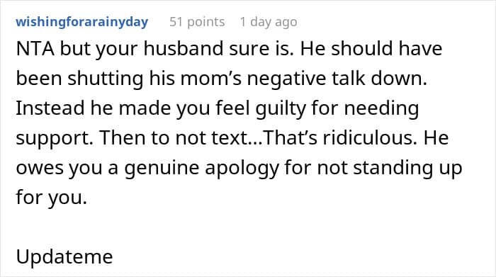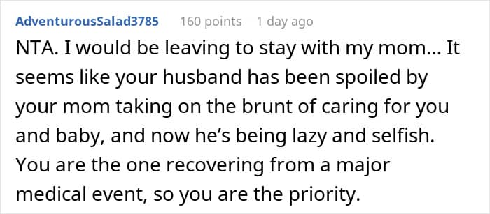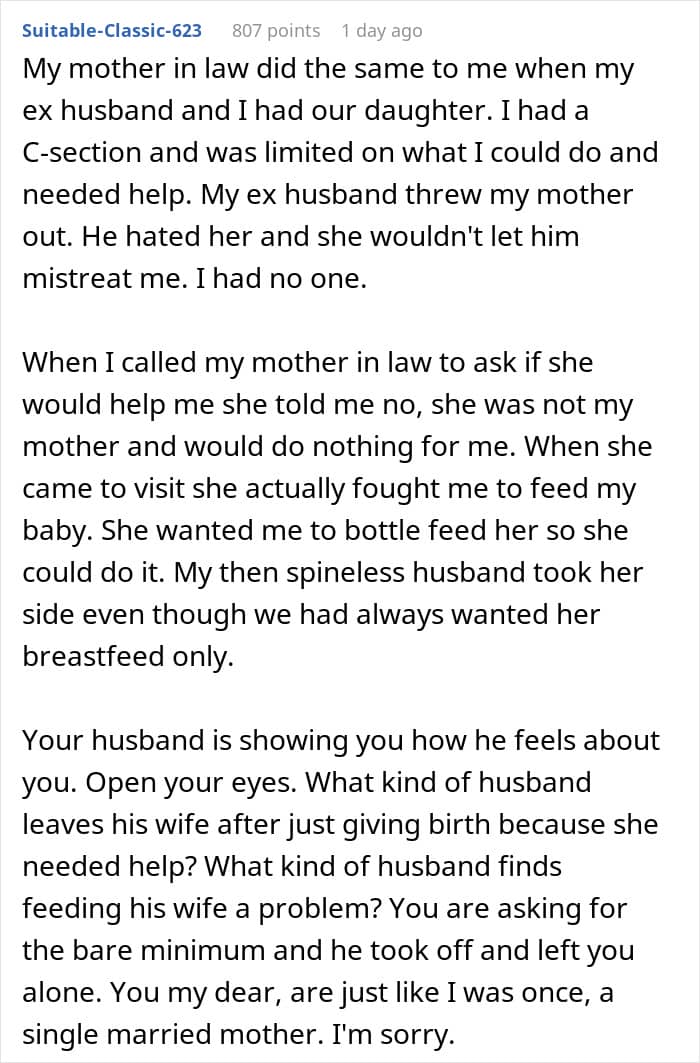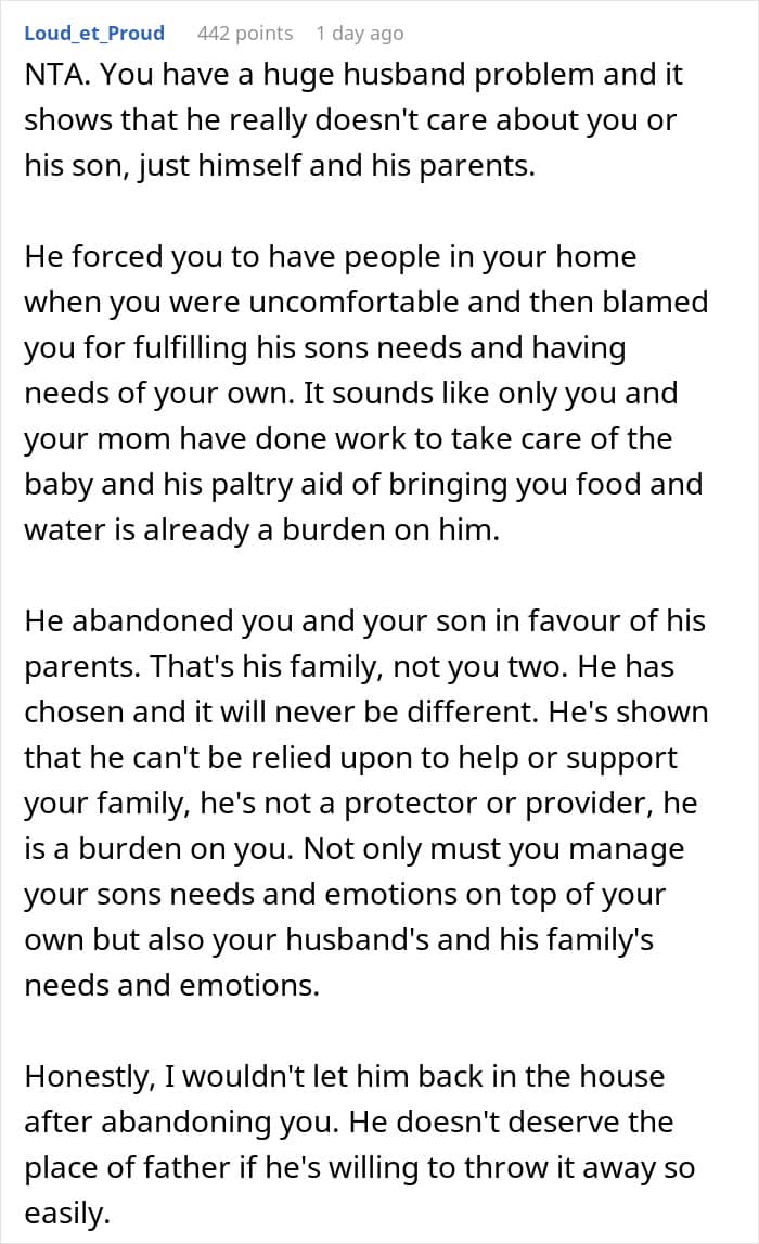 Not only that, but the author’s husband also seemed to be more on his parents’ side than his own wife’s. When there’s a newborn at home, everything should revolve around its and its mother’s well-being. Everyone else’s wants, meanwhile, temporarily end up on the back burner.