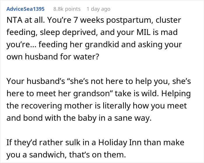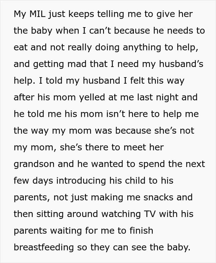 There is no excuse for the way that the woman’s mother-in-law treated her. It felt like the MIL was more interested in her own first-time grandma experience than supporting her exhausted daughter-in-law in any shape or form.