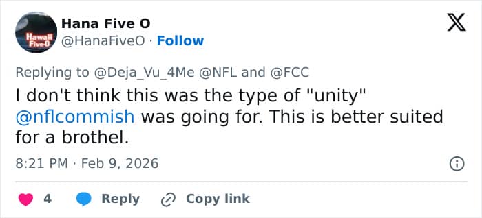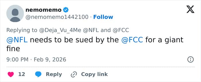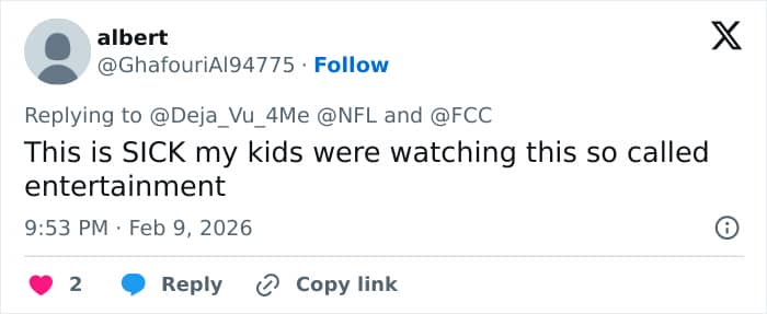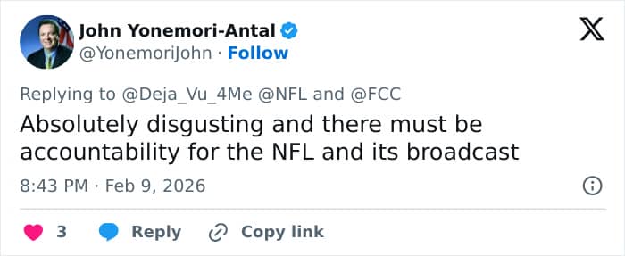 “I am requesting that the Energy and Commerce Committee launch a formal congressional inquiry into the National Football League and NBC immediately for their prior knowledge, deliberate approval, and facilitation of this indecent broadcast,” he wrote in his tweet.