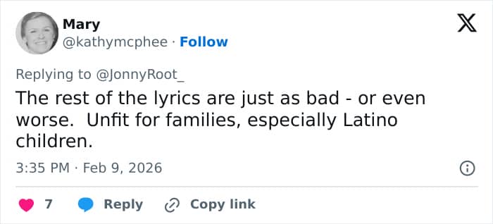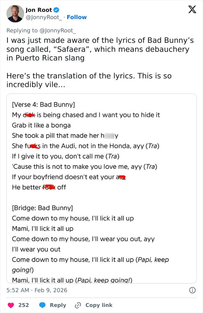 Megan Basham shared screenshots of the original lyrics of Bad Bunny’s Safaera on X, in which he sings about explicit s**ual acts, casual hookups, and the use of illicit substances.