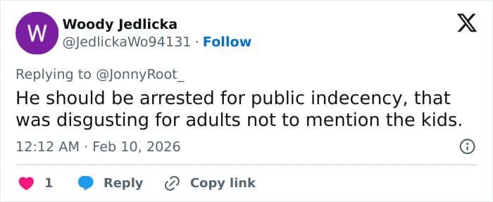 “He should be arrested for public indecency,” one critic commented online, while another netizen asked, “Why the outrage? Trump said he could grab em by the p**sy. Our president”