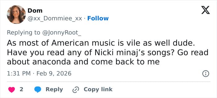 “Isn’t Nicki Minaj like on your team now? Have you SEEN her videos? Trick question – we all know none of you have,” one said.