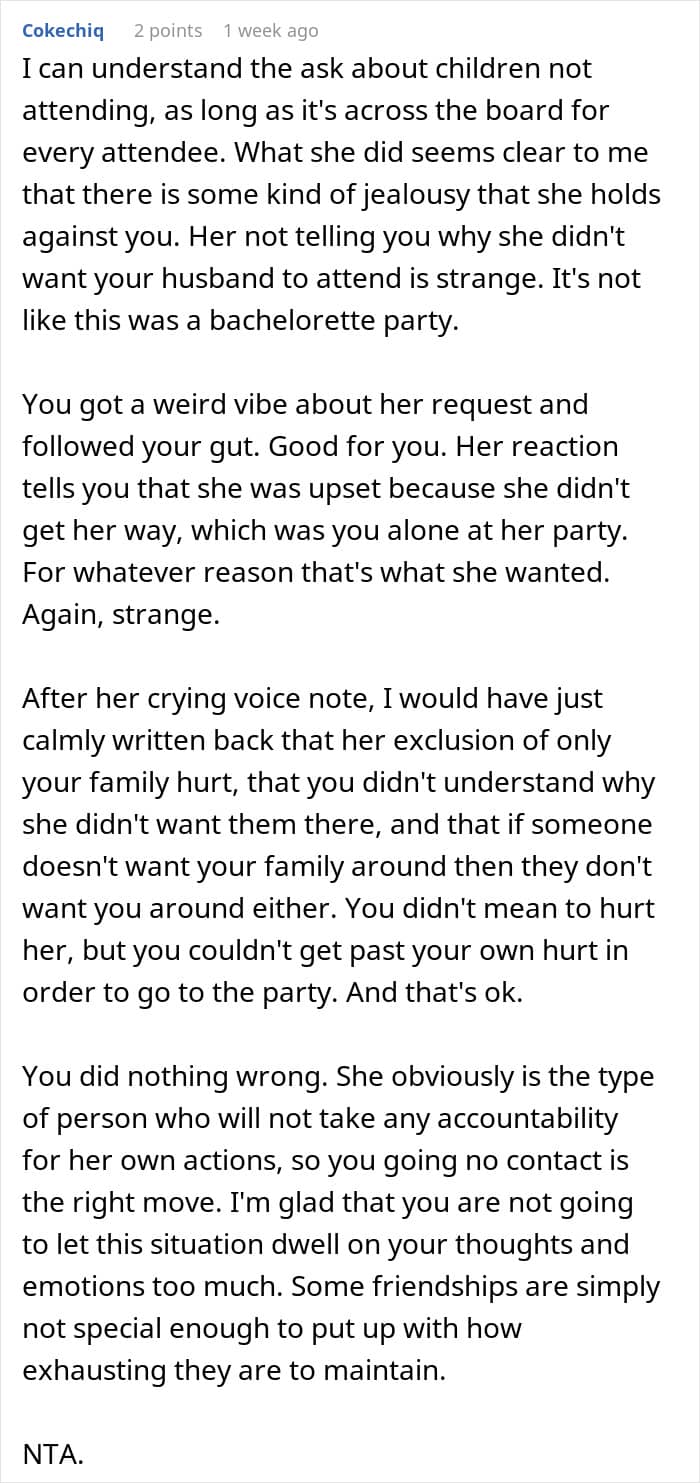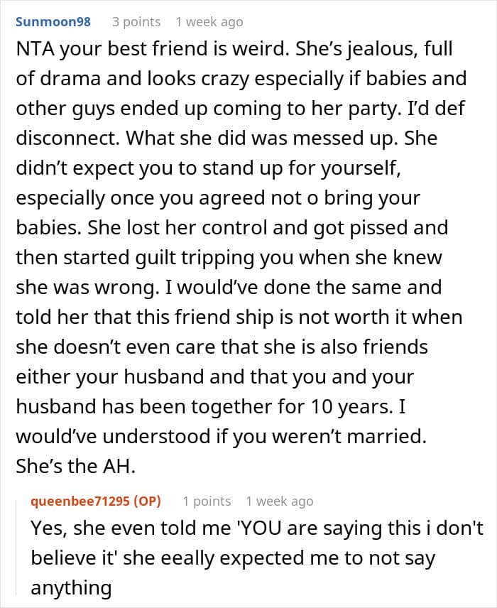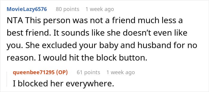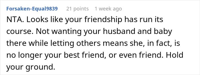 In a post on r/AITAH, she laid out the double standards her friend had enforced — from banning her baby to suddenly uninviting her husband — and asked if she was in the wrong for standing her ground.