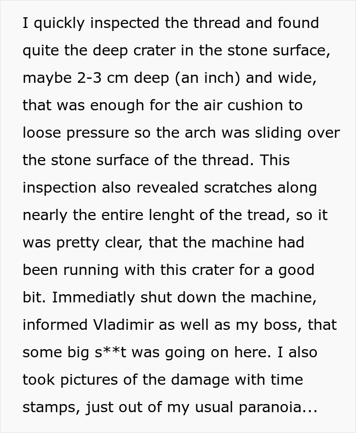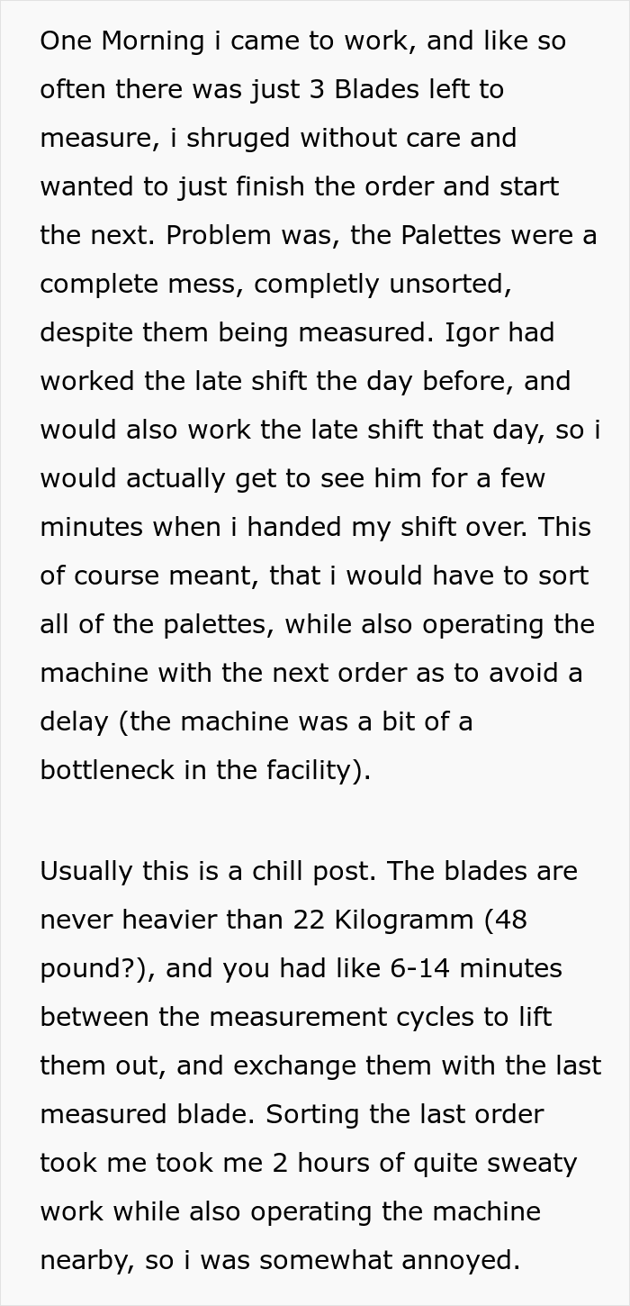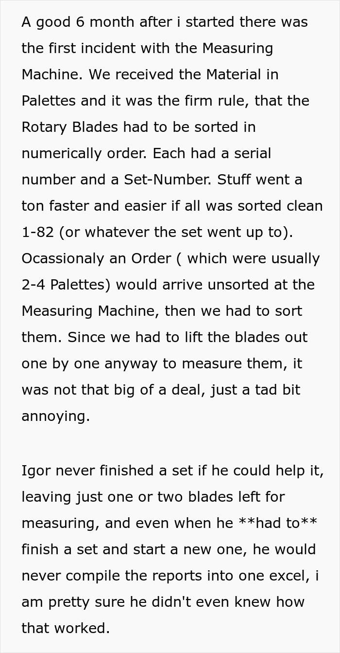 There was also a man working in the department named Igor, who was a rather negligent person and kept his job solely due to the fact that he was the brother of Freddie – the OP’s boss’ boss. For a year, Igor made crucial mistakes several times in working with the machine, which then had to be eliminated by the author of the post.