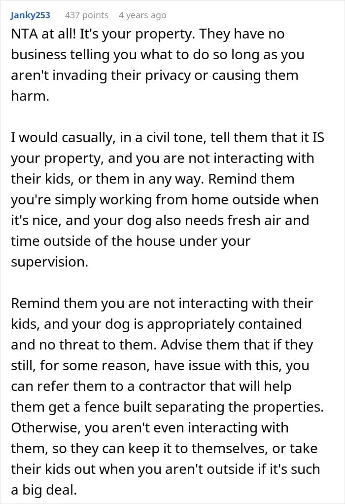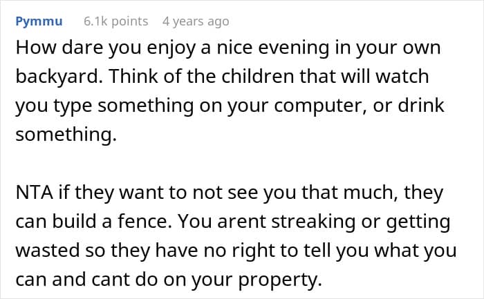 The man, who has done absolutely nothing wrong except exist on his own land, is starting to doubt himself. He’s wrestling with the absurdity of their demands but also questioning if he should just give in to keep the peace. He turned to the internet to ask if he’s the jerk for refusing to vanish from his own backyard every time his neighbors’ kids want to go outside.