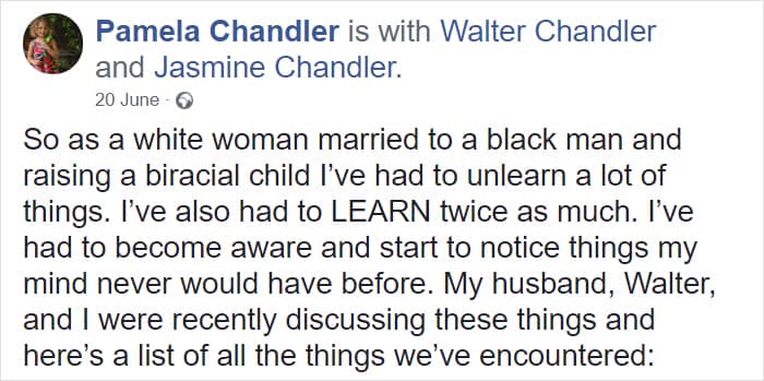 Pamela Chandler got seriously fed up with all the posts in her social media feeds arguing that ‘racism isn’t a thing’. People in her online social circles were saying they are tired of the protests and didn’t understand Black Lives Matter. So, to give everyone a chance to broaden their worldview, Pamela — a white woman who is married to a black man — shared an open letter on Facebook about how racism has shaped her family’s everyday life.